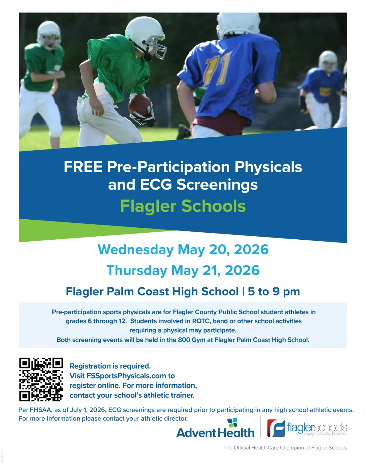 Registration is required and can be completed by scanning the QR code on the event flyer or by visiting www.FSSportsPhysicals.com.